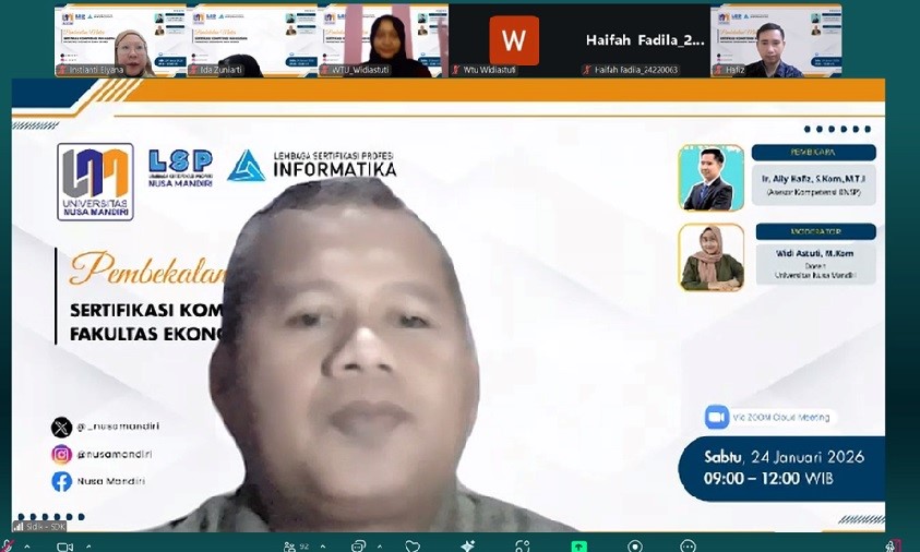 NusamandiriNews, Jakarta–Universitas Nusa Mandiri (UNM) sebagai Kampus Digital Bisnis terus memperkuat kualitas lulusan agar siap bersaing di dunia kerja digital. Salah satu langkah strategis yang dilakukan adalah melalui kegiatan Pembekalan Sertifikasi Kompetensi Mahasiswa skema Digital Marketing yang diselenggarakan oleh Fakultas Ekonomi dan Bisnis (FEB) UNM pada Sabtu (24/1), secara daring.