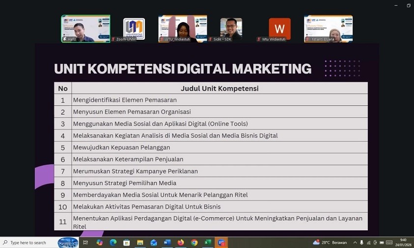 NusamandiriNews, Jakarta–Fakultas Ekonomi dan Bisnis (FEB) Universitas Nusa Mandiri (UNM) kembali menunjukkan komitmennya dalam menyiapkan lulusan yang siap bersaing di dunia kerja melalui kegiatan Pembekalan Materi Sertifikasi Kompetensi Digital Marketing, yang diselenggarakan pada Sabtu (24/1), secara daring pukul 09.00 hingga 12.00 WIB.