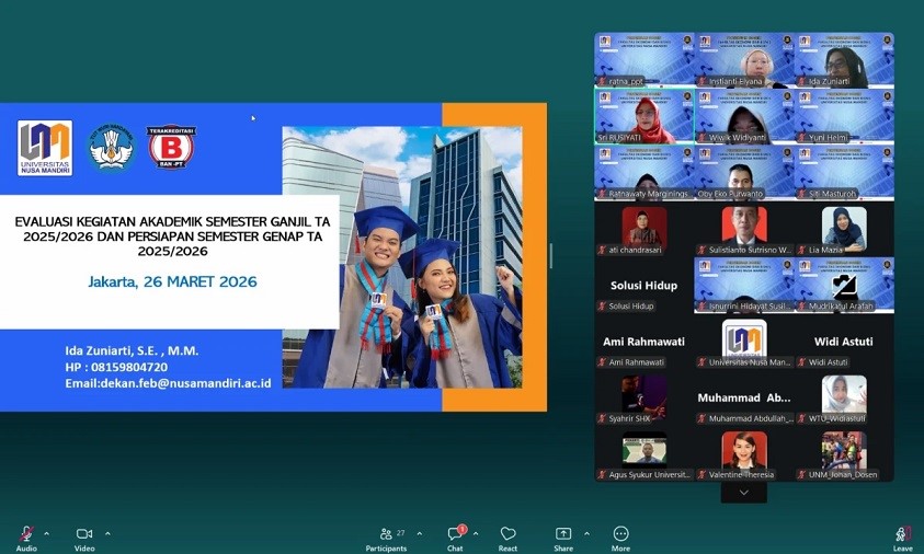 NusamandiriNews, Jakarta – Fakultas Ekonomi dan Bisnis (FEB) Universitas Nusa Mandiri (UNM) sebagai Kampus Digital Bisnis menggelar kegiatan Pertemuan Dosen pada Kamis (26/3) pukul 14.00–16.00 WIB secara daring melalui Zoom Meeting. Kegiatan ini menjadi langkah strategis dalam memperkuat kualitas akademik dan sinergi antar dosen.