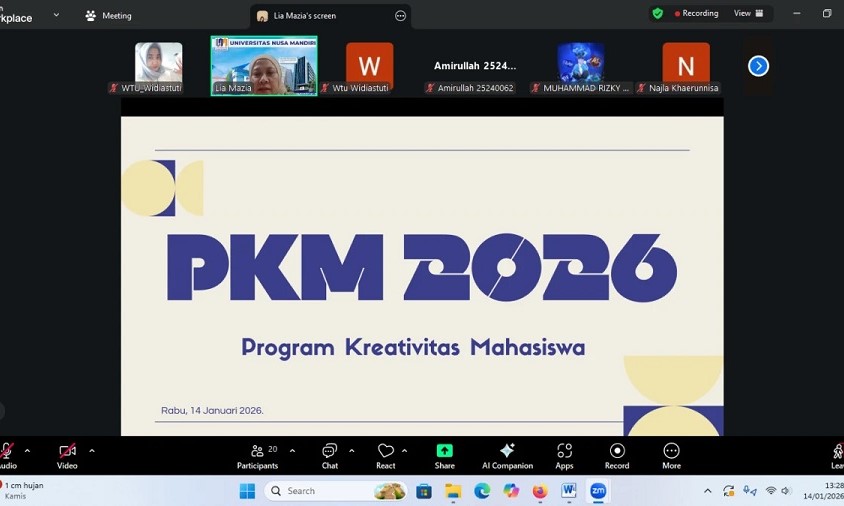 NusamandiriNews, Depok–Program Studi Bisnis Digital Universitas Nusa Mandiri (UNM) menggelar rapat persiapan penyusunan proposal Program Kreativitas Mahasiswa (PKM) dan Program Pembinaan Mahasiswa Wirausaha (P2MW), Rabu (14/1). Kegiatan yang berlangsung secara daring ini menjadi langkah awal memperkuat kesiapan mahasiswa menghadapi kompetisi hibah nasional.