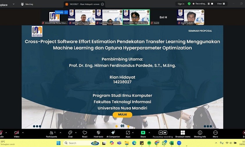 NusamandiriNews, Jakarta – Program Studi Magister Ilmu Komputer Fakultas Teknologi Informasi (FTI) Universitas Nusa Mandiri (UNM) sukses menggelar rangkaian Seminar Proposal Tesis yang berlangsung intensif selama enam hari, sejak 9 hingga 14 Oktober 2025. Kegiatan akademik ini menjadi ajang penting bagi mahasiswa untuk mempresentasikan rencana penelitian yang berfokus pada dua bidang unggulan, yakni Software Engineering dan Data Science.