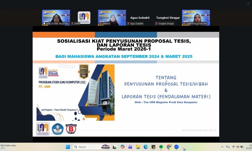 NusamandiriNews, Jakarta–Program Studi Ilmu Komputer (S2), Fakultas Teknologi Informasi Universitas Nusa Mandiri (UNM) sebagai Kampus Digital Bisnis sukses menyelenggarakan kegiatan Sosialisasi Penulisan Proposal Penelitian dan Pedoman Penyusunan Tesis bagi mahasiswa Ilmu Komputer pada Kamis (27/11) secara daring melalui Zoom Meeting.