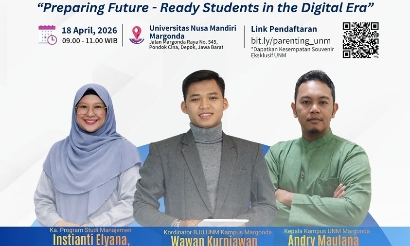 NusamandiriNews, Depok — Universitas Nusa Mandiri (UNM) sebagai Kampus Digital Bisnis akan menggelar Workshop Parenting Beasiswa Jalur Undangan 2026 pada Sabtu (18/4) pukul 09.00–11.00 WIB di UNM Kampus Margonda, Jalan Margonda Raya No. 545, Pondok Cina, Depok, Jawa Barat. Kegiatan ini mengusung tema “Preparing Future-Ready Students in the Digital Era” dan menyasar siswa serta orang tua calon mahasiswa.