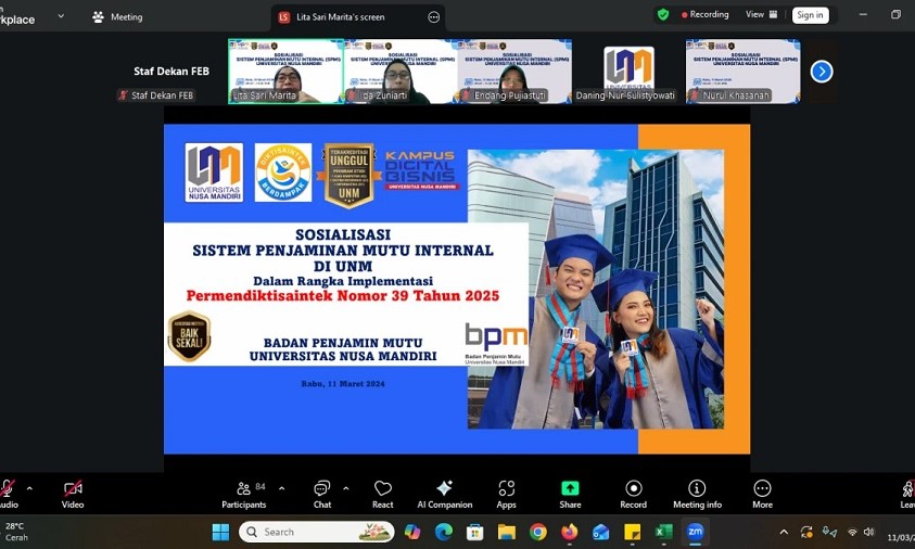 NusamandiriNews, Depok – Dalam upaya memperkuat kualitas pendidikan tinggi, Fakultas Ekonomi dan Bisnis (FEB) Universitas Nusa Mandiri (UNM) sebagai Kampus Digital Bisnis turut berpartisipasi dalam kegiatan Sosialisasi Sistem Penjaminan Mutu Internal (SPMI) yang diselenggarakan oleh Badan Penjaminan Mutu (BPM) Universitas Nusa Mandiri. Kegiatan ini dilaksanakan pada Rabu (11/3) pukul 09.00–11.00 WIB secara daring.
