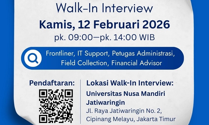 NusamandiriNews, Jakarta–Nusa Mandiri Career Center (NCC) Universitas Nusa Mandiri (UNM) kembali menegaskan komitmennya dalam menyiapkan mahasiswa dan alumni agar siap terjun ke dunia kerja. Melalui kegiatan Campus Hiring bersama PT Sumberdaya Dian Mandiri, UNM membuka akses langsung rekrutmen kerja yang akan digelar pada Kamis, 12 Februari 2026, bertempat di Universitas Nusa Mandiri Kampus Jatiwaringin, Jl Jatiwaringin Raya No 2, Cipinang Melayu, Makasar, Jakarta Timur.