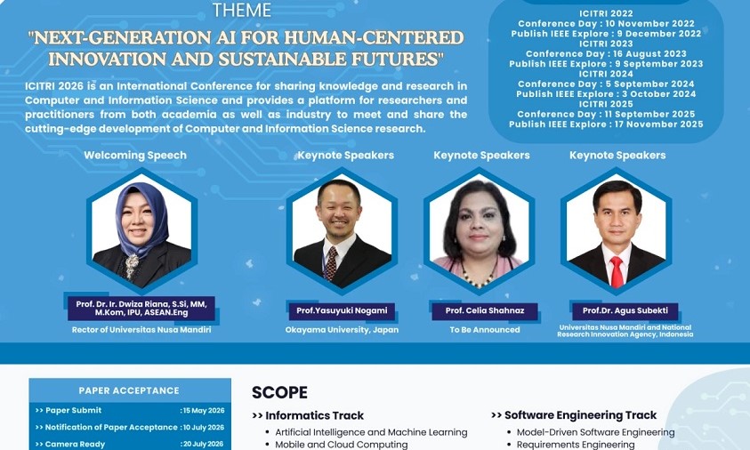 Melalui penyelenggaraan ICITRI 2026, Universitas Nusa Mandiri terus memperkuat perannya sebagai pusat riset dan inovasi teknologi, sekaligus memperluas jejaring kolaborasi global.
