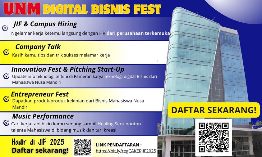 NusamandiriNews, Jakarta — Universitas Nusa Mandiri (UNM) sebagai Kampus Digital Bisnis akan menggelar Company Talk pada Sabtu 6 Desember 2025, bersamaan dengan rangkaian acara UNM Digital Bisnis Fest (DBF) 2025. Kegiatan ini akan berlangsung di UNM kampus Margonda dan akan menjadi sorotan utama karena menghadirkan perwakilan dari berbagai perusahaan nasional dan multinasional untuk berbagi wawasan langsung kepada mahasiswa.