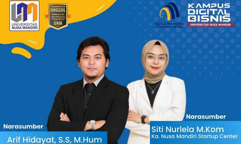 Kegiatan ini menghadirkan dua narasumber inspiratif, yaitu Arif Hidayat, Wakil Rektor II Bidang Non Akademik, dan Siti Nurlela, Kepala Nusa Mandiri Startup Center (NSC).