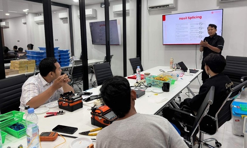 Pelatihan berlangsung intensif selama dua hari dan mencakup berbagai materi penting mulai dari pengenalan jenis-jenis kabel fiber optic, teknik penyambungan kabel atau splicing, hingga praktik langsung membangun jaringan FTTH (Fiber To The Home). Para peserta tidak hanya mempelajari teori, tetapi juga terjun langsung melakukan instalasi, konfigurasi, dan pengujian jaringan fiber dengan peralatan standar industri.