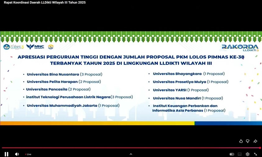 NusamandiriNews, Jakarta–Universitas Nusa Mandiri (UNM) sebagai Kampus Digital Bisnis kembali menegaskan komitmennya dalam membina inovasi, kreativitas, dan budaya riset di kalangan mahasiswa. Pada kegiatan Rapat Koordinasi Daerah (Rakorda) LLDikti Wilayah III Tahun 2025, UNM menerima apresiasi sebagai salah satu perguruan tinggi yang berhasil meloloskan satu proposal Program Kreativitas Mahasiswa (PKM) untuk berkompetisi di Pekan Ilmiah Mahasiswa Nasional (PIMNAS) ke-38 yang digelar di Universitas Hasanuddin, Makassar.